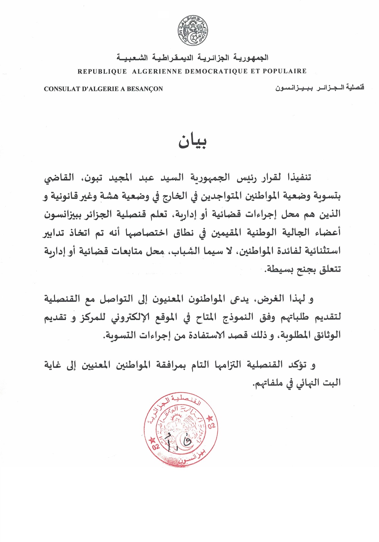 بـــيــــان – إجـــرائــات الــتـــســويــة