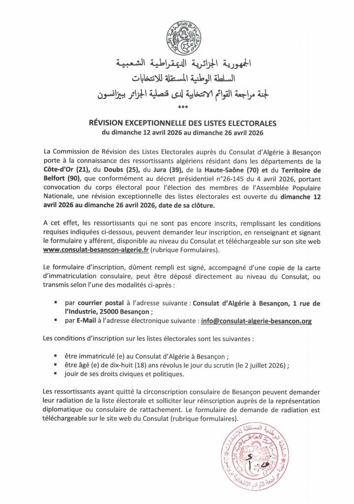 Révision exceptionnelle des listes électorales – du 12 au 26 avril 2026